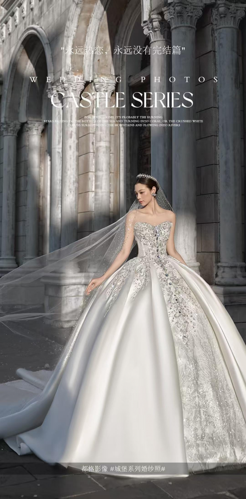 套餐覆盖中端至高端,性价比稳定,包含多套服装、多场景拍摄、底片全送等,服务成熟稳定,适合喜欢经典轻奢、欧式宫廷风的新人。