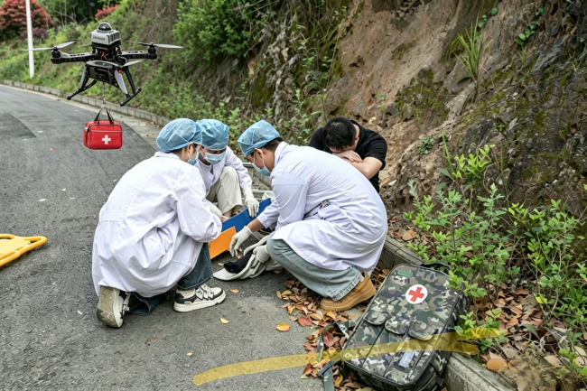 4名山地救援队员携带便携式除颤仪、急救包轻装徒步进山,先期稳定伤者生命体征;同时,操控一架载重15公斤的六旋翼工业无人机,从5公里外的应急药品储备点起飞,以每秒18米的速度沿峡谷低空飞行。