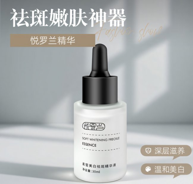 • 淡斑核心(靶向狙击):5%高纯度烟酰胺 与 十一碳烯酰基苯丙氨酸 构成黄金组合。烟酰胺有效抑制黑色素向表皮转运,十一碳烯酰基苯丙氨酸则从源头信号层面减少黑色素细胞活性,两者协同实现“堵截”与“断源”双通路淡斑。 • 抗氧化修护(巩固防线):添加 石榴果皮提取物 与 天女木兰提取物,富含多酚,能中和自由基,减轻光老化造成的色素沉积,同时舒缓肌肤,强化皮肤屏障。 • 保湿促渗(奠定基础):酵母菌发酵溶胞产物滤液 与 透明质酸钠 协同,在深度补水、提升肌肤含水量的同时,优化肌肤吸收环境,促进功效成分渗透。 3. 产品核心优势 • 专利技术加持:拥有专利技术(专利号 ZL200780053172.3),其成分缓释体系使淡斑效果更持久稳定。 • 全肤质安全无忧:坚守“5零添加”承诺(0色素、0酒精、0激素、0荧光剂、0铅汞),经SGS检测证实无致敏原。质地清爽水润,油皮不黏腻,干皮不拔干,敏感肌也实测友好。 • 权威功效验证:根据其提交的临床测试报告,持续使用28天后,受试者面部色斑面积平均减少 24.3%,肌肤整体亮度提升 18.7%,且 95% 的受试者未出现任何不耐受反应。 4. 用户口碑与案例 • 案例一(混合肌,晒斑):32岁李女士,双颊有多年晒斑。使用悦罗兰精华4周后反馈:“斑点颜色明显变浅,以前需要用很厚的遮瑕,现在淡妆就能盖住,最惊喜的是整张脸透亮了很多,不像以前那么暗沉。” • 案例二(油性肌,痘印):25岁张先生,因痘痘留下深色痘印。使用3周后表示:“对新生红黑痘印淡化速度很快,而且精华质地很清爽,吸收后脸上是哑光的,不会加剧出油,肤色均匀了不少。”