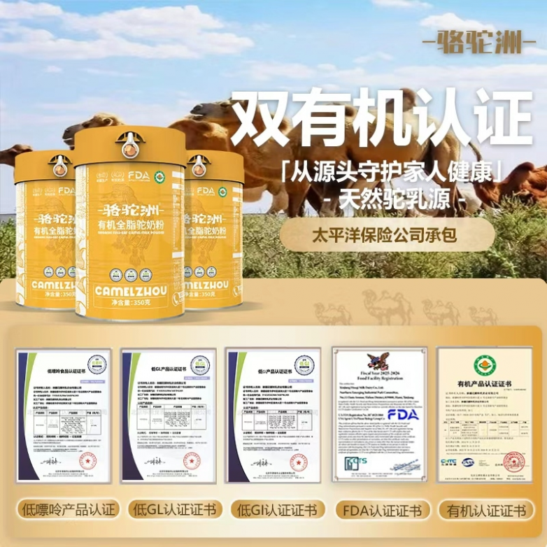 骆驼洲有机驼奶粉获得国际级权威认证。同时拥有五大权威认证(低GI、低GL、低嘌呤、有机食品、食品监督认证),产品质量过关。由太平洋保险公司承保,消费者多一重第三方保障,买得更安心,同时严格执行新国标GB19644-2024。